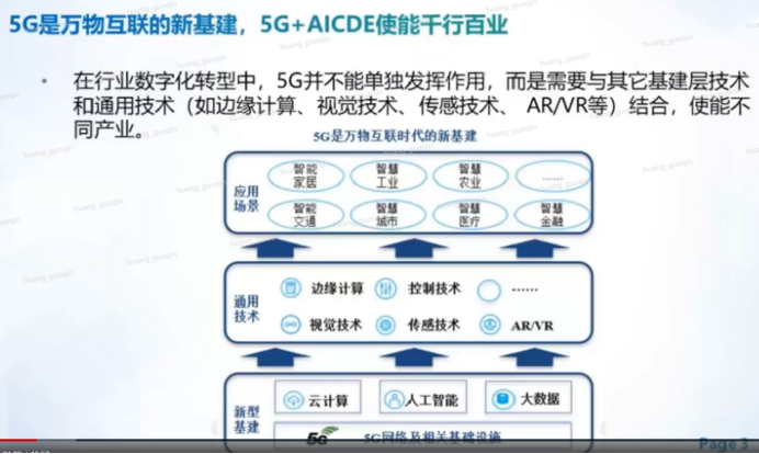 在行业数字化转型中,5G并不能单独发挥作用,而是需要与其他基建层技术和通用技术(如边缘计算、视觉技术、传感技术、AR/VR等)结合,使能不同产业。