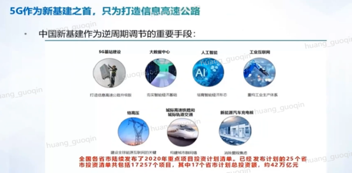 5G作为新基建之首,打造的是一条信息高速公路。依托于5G基站建设,我们构建了大数据中心的数据,夯实智能经济基础。有了数据以后,我们做人工智能时有了低时延、高可靠性的连接,培育了智能经济形态。也可以做工业互联网重构工业生产体系。新基建还有特高压建设全球能有互联网、城际高速铁路和城际轨道交通构建城市群网络、新能源汽车充电桩消除里程焦虑等功能。