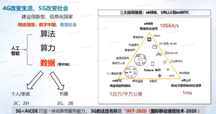 基于这样三个方面,5G它能够催生出很多内容,5G结合了底层的人工智能,未来的AI需要有数据,而5G可以为数据提供重要的来源。当我们要做大量的人工智能,它需要各种数据来进行训练,通过训练来成熟算法,再加上算力,朝着人工智能方向来进行发展。
