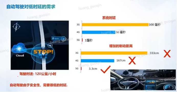 按照驾驶时速每小时120公里,如果说按照3G的时间是100毫秒,它的自动距离驾驶是0.3米。如果是4G是50毫秒,127厘米。而5G的一毫秒是3.3厘米。