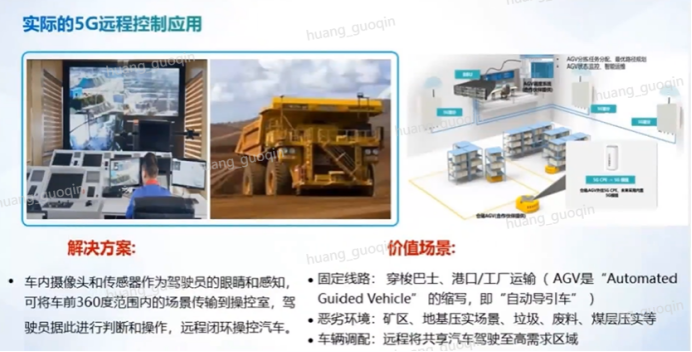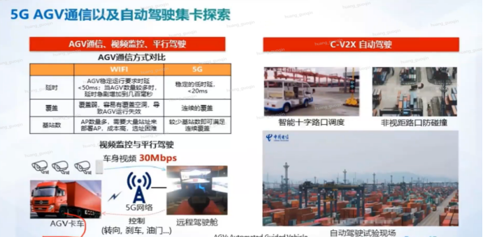 - 无人驾驶运输车:5G替代WiFi控制AGV,并提供监控和平行驾驶,未来支持V2X自动驾驶。