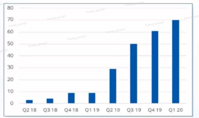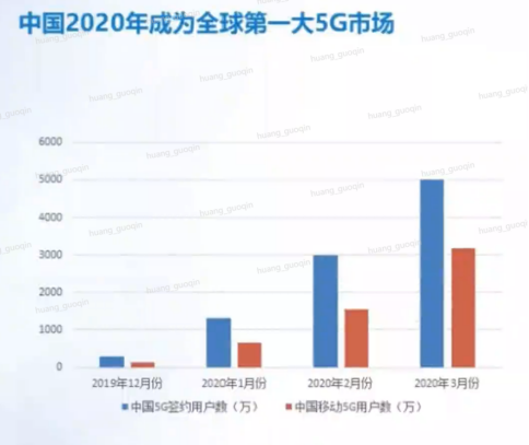 截止2019年12月底,全国有300万5G签约用户;2020年1月份,5G签约用户数超过1300万;到2020年3月份,,5G签约用户数超过5000万,中国移动3月5G用户大增1632万户,累计达到3172万户,GSMA预计,2020年70%的5G连接来自于中国,5G初期发展速度远超4G。