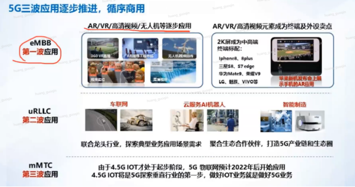 - eMBB第一波应用,AR/VR/高清视频/无人机等逐步应用,AR/VR/高清视频元素成为终端及外设卖点。
