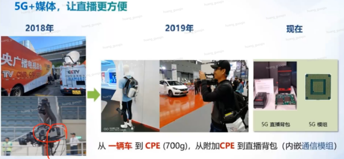 5G+媒体直播是通过5G网络,支持电视节目、在线赛事等高清直播,给观众带来身临其境的沉浸式体验,从一辆车到CPE(700g),从附加CPE 到直播背包(内嵌通信模组)。