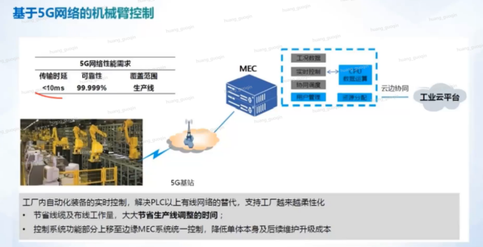5G以其大带宽、低时延特性将工业相机获取的高清图像、点状云图等现场数据信息,快速精准的送至云端,经过深度学习图形图像处理等技术,实现质量缺陷检测、机器精准引导、OCR等功能,最终将计算结果重新通过5G反馈给前端执行。
