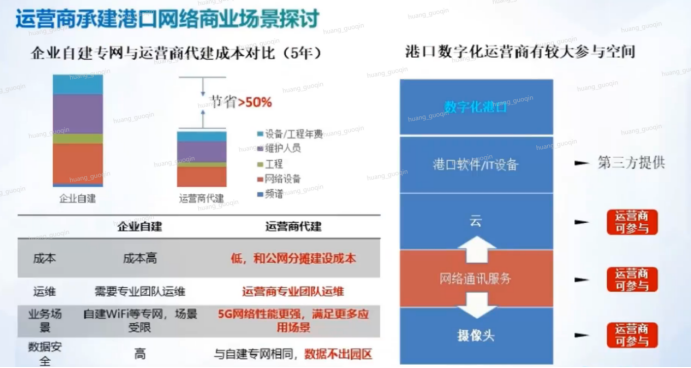 企业自建专网与运营商代建成本对比中,企业自建成本高,需要专业团队运维,自建建WiFi等专网,场景受限,但数据安全高。运营商代建成本低,和公网分排建设成本;运营商专业团队运维,5G网络性能更强,满足更多应用场景,但与自建专网相同,数据不出园区。