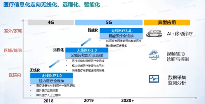 无线医疗3.0(智能化):智能医疗全连接;5G医疗专网使能云化智能医疗,随时随地医疗服务。