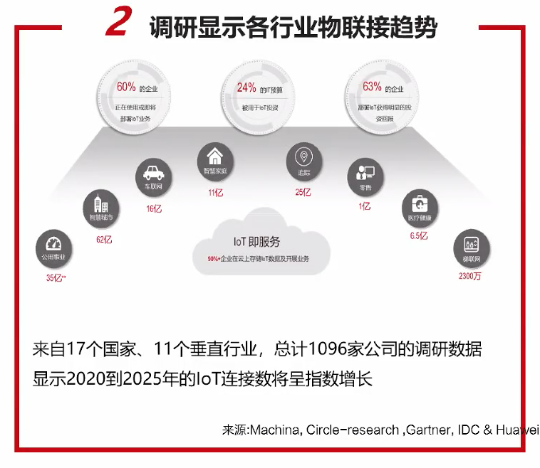 感知物理世界,让物变成数字信号,需要解决数字化感知、联接和商业价值闭环的问题。通过调研显示各行业物联接趋势,发现来自17个国家、11个垂直行业,总计1096家公司的调研数据显示2020年到2025年的IoT连接数将呈指数增长。