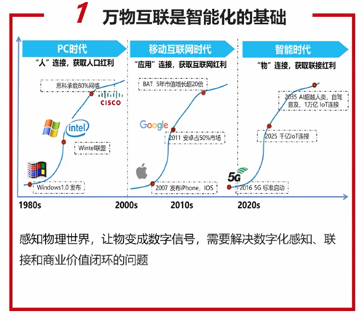 智能时代,物联网是万物互联的基础链接平台。万物互联是智能化的基础,从PC时代到移动互联时代,再到智能时代是历史的发展趋势。