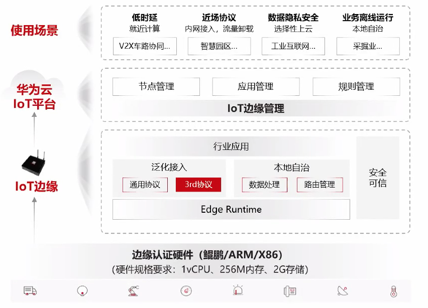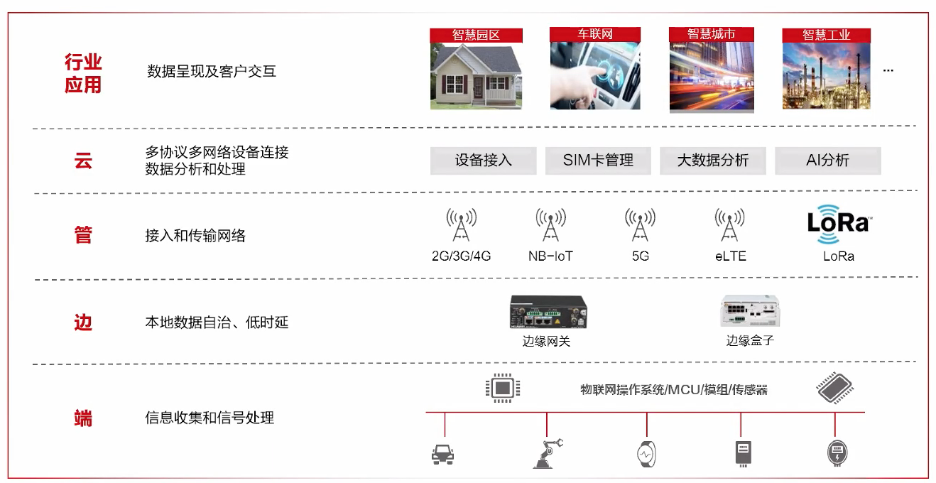 作用是本地数据自治、低时延,比如边缘网关、边缘盒子;管的作用是接入和传输网络,比如2G、3G、4G、eLTE等基站;云的作用是多协议多网络设备连接数据分析和处理,比如设备接入、SIM卡管理、大数据分析、AI分析等;行业应用主要是数据呈现及客户交互,比如智慧园区、车联网等。