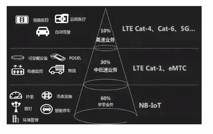 端侧硬件也是实现设备联网的通信模组,通过网络状态划分业务类型,60%是窄带业务,30%是中低速业务,10%是高速业务。