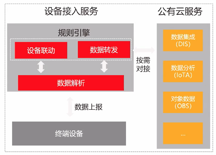 规则引擎完成数据流转和设备联动,基于规则引擎可进行数据转发其他公有云服务,和引发多设备协同(提醒、告警通知、状态报告等)。其中,数据转发,无缝与公有云其他服务对接,实现设备数据按照需要流转和处理。