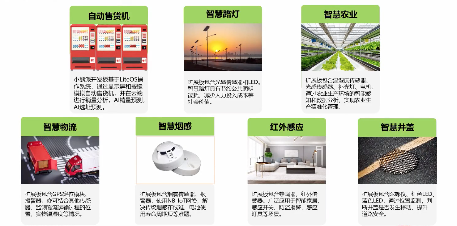 开发板套件案例集,比如自动售货机、智慧路灯、智慧农业、智慧物流、智慧烟感、红外感应、智慧井盖。以智慧路灯举例,路灯的扩展板中包含光感传感器和LED灯,当检测的外界光照低于预设的阈值时,会自动启动LED灯实现照明功能,从而减少了人力投入。