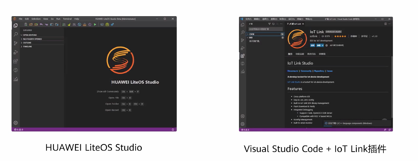 如下图所示,第一个是官方推荐的标准开发工具,第二个是VSCode结合IoT插件的形式。