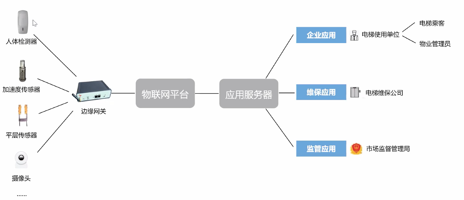 不同设备传感器收集到信息后,通过边缘网关上传到物联网平台,最后结合应用服务器完成特定的功能。整个模块关系如下图所示: