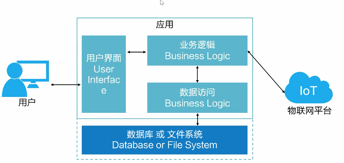 物联网Web应用典型框架,用户在浏览器端,通过应用的用户图形界面进行操作,完成业务逻辑内容,同时,与物联网平台进行通讯,最后访问应用数据库或者文件系统完成数据和文件的增删改查。