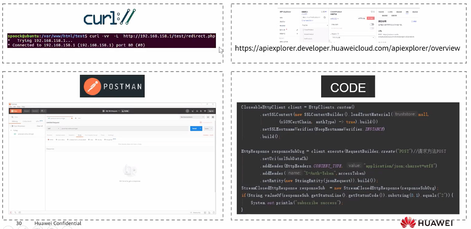 开发调试的四种方法,第一种是命令行形式,使用工具 curl。第二种是使用华为云提供的在线API完成开发调试。第三种是使用PostMan测试工具,一般用户采用这种方式的比较多。第四种就是通过编写自定义代码完成开发调试,一般开发人员或者白盒测试人员会采取这种方式。