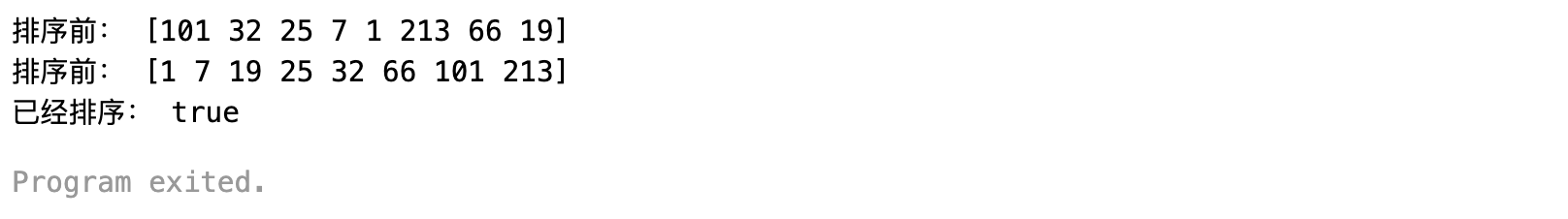 排序前: [101 32 25 7 1 213 66 19] 排序前: [1 7 19 25 32 66 101 213] 已经排序: true