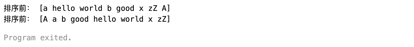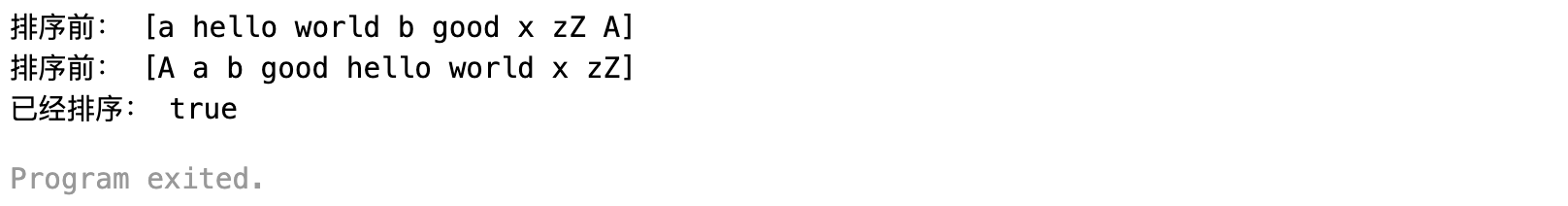 排序前: [a hello world b good x zZ A] 排序前: [A a b good hello world x zZ] 已经排序: true