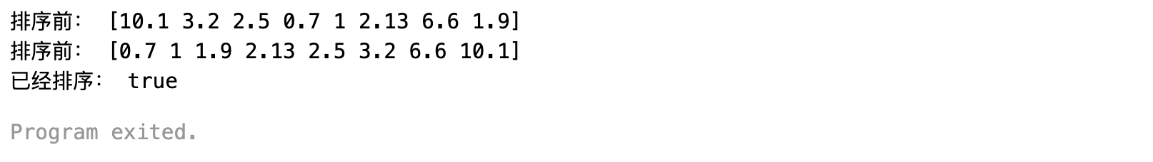 排序前: [10.1 3.2 2.5 0.7 1 2.13 6.6 1.9] 排序前: [0.7 1 1.9 2.13 2.5 3.2 6.6 10.1] 已经排序: true