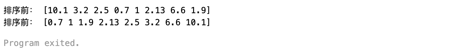 排序前: [10.1 3.2 2.5 0.7 1 2.13 6.6 1.9] 排序前: [0.7 1 1.9 2.13 2.5 3.2 6.6 10.1]