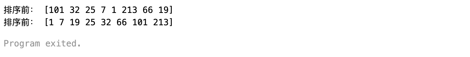 排序前: [101 32 25 7 1 213 66 19] 排序前: [1 7 19 25 32 66 101 213]