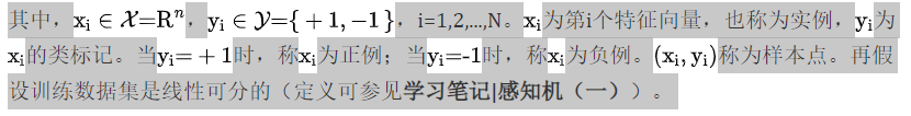 线性可分支持向量机定义: 给定线性可分训练数据集,通过间隔最大化或等价地求解相应的凸二次规划问题学习得到的分离超平面为