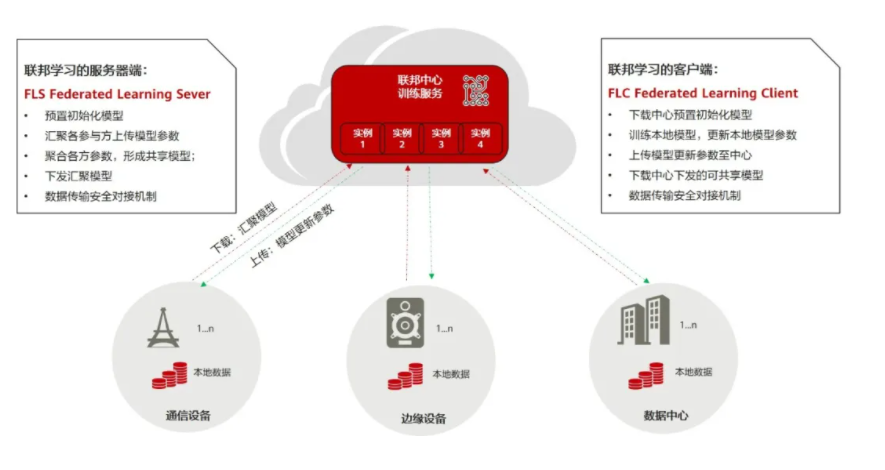 2. 全场景的联邦学习支持及灵活的部署模式:区别于业界联邦学习复杂的功能区分,网络人工智能联邦学习通过服务端(Federated Learning Server)+客户端(Federated Learning Client)这种简洁的功能区分,实现了全场景的联邦学习,灵活的部署在通信领域的不同联邦学习场景。