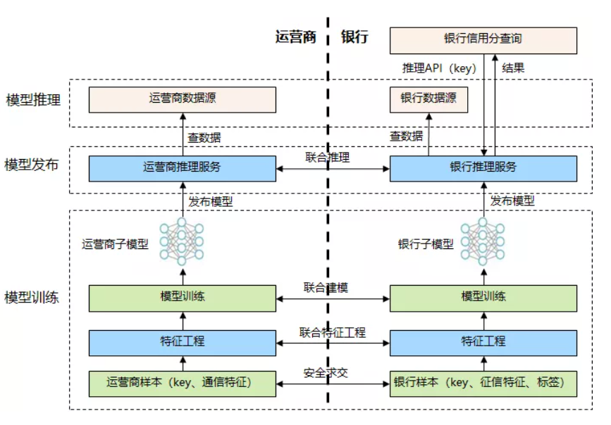 银行在构建信用分模型时,需要对用户信用评估,为了更精准、更全面的刻画用户信用情况,银行和运营商联合共建风控模型。银行和运营商都涉及用户个人隐私数据,数据不能出局,不能集中数据训练模型。