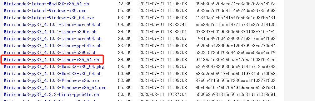 需要选择一个Linux系统、x84_64架构的,比如Python3.7版本的  Miniconda3-py37_4.10.3-Linux-x86_64.sh