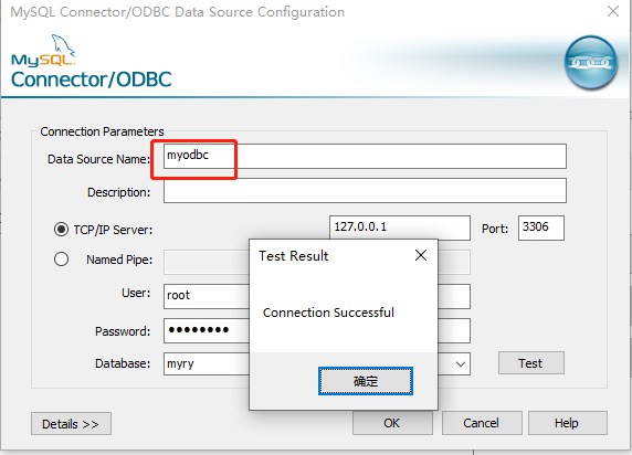 此处的连接名是myodbc,使用时用myodbc,不需要再使用jdbc那套信息了。