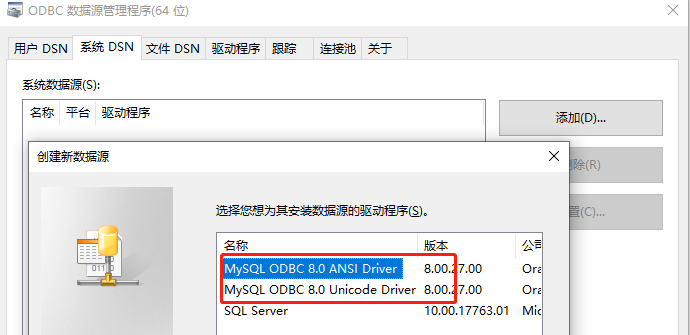 安装完重新打开odbc64 服务,会多出来两个MySQL配置项,ansi 和 Unicode,选Unicode 使用双击添加连接。