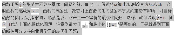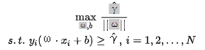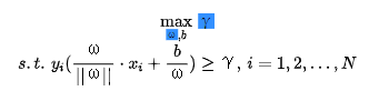 即我们希望最大化超平面(ω,b)关于训练数据集的几何间隔γ,约束条件表示的是超平面(ω,b)关于每个训练样本点的几何间隔至少是γ。