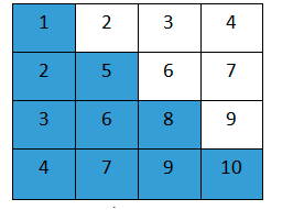 假设有n阶矩阵A,因为n阶矩阵具有aij=aji 1<= i,j<=n的性质,对于矩阵中的n2个元素,我们只需存储n(n+1)/2个元素即可,即下图中的蓝色部分: