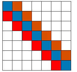 对角矩阵通常是指以主对角线为中心,上下若干条对角线为非零元素,其它元素均为零。这样我们可以只存储对角线上的元素即可,如下图所示: