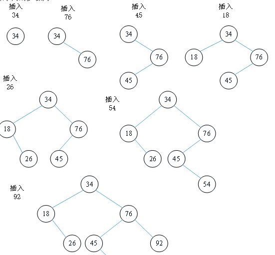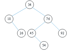 假设有关键字序列(34,76,45,18,26,54,92),由这组记录关键字生成的二叉排序树为: