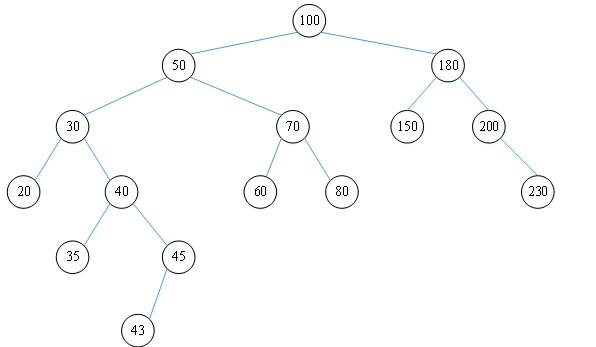 (2)删除只有一个左孩子或右孩子的结点:如果删除值为45的结点,只需要将值为40结点的右孩子指针指向43结点即可,然后释放值为45的结点;删除值为200的结点同理;