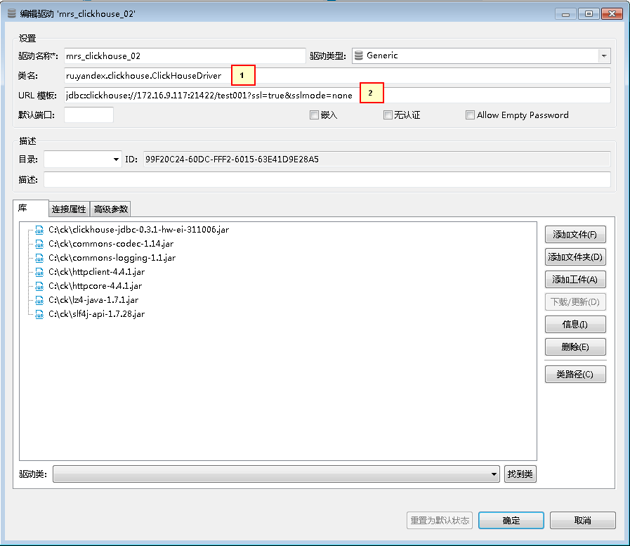 获取clickhouse jdbc驱动: https://mirrors.huaweicloud.cn/repository/maven/huaweicloudsdk/ru/yandex/clickhouse/clickhouse-jdbc/