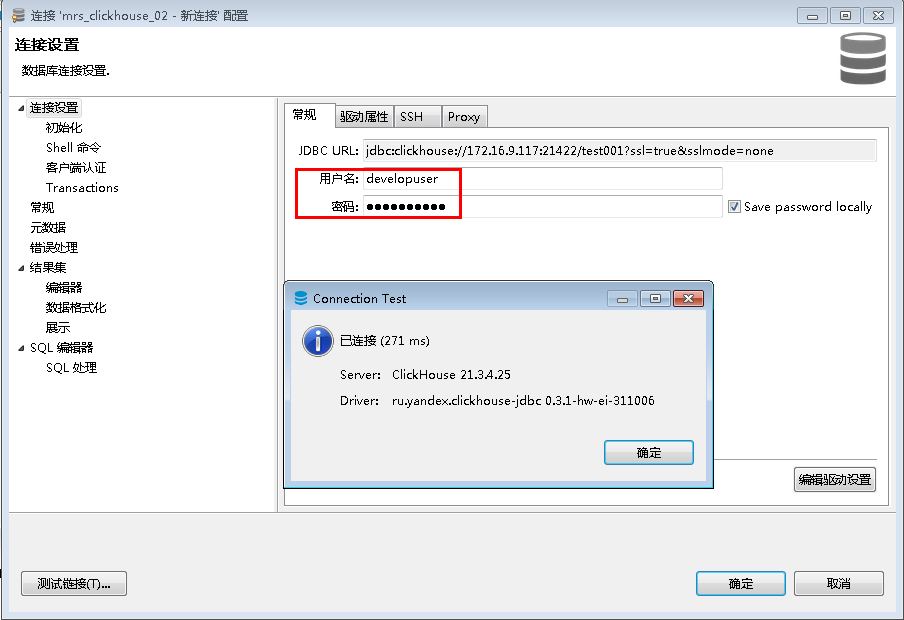 新建的连接名字为mrs_clickhouse_02,连接信息如下,完成后点击OK