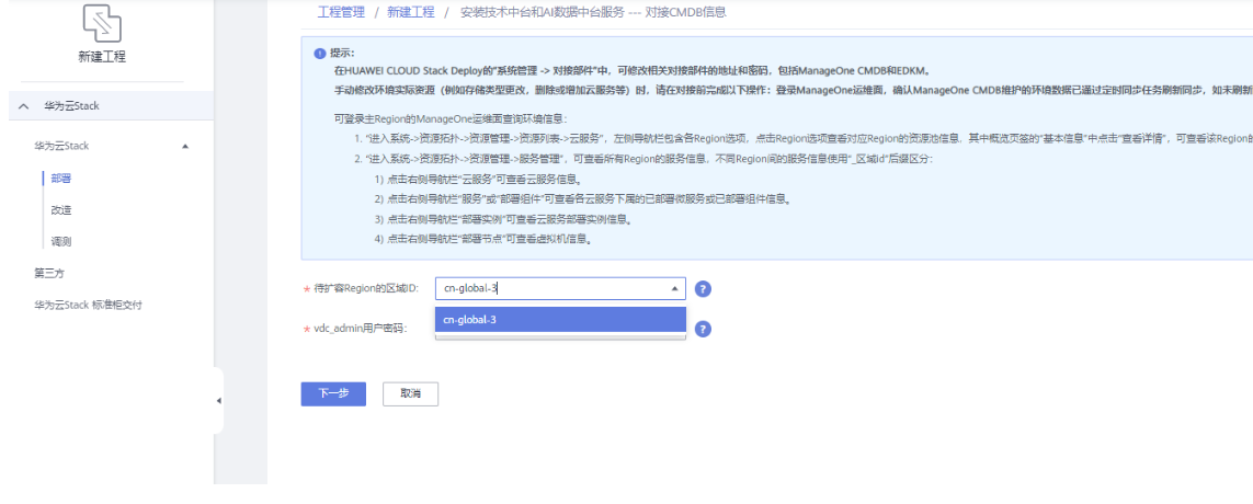 在“对接CMDB信息”页面,在“待扩容Region的区域ID”下拉框内选择需要安装MRS的region,填写vdc_admin账号密码,密码从账号一览表获取;