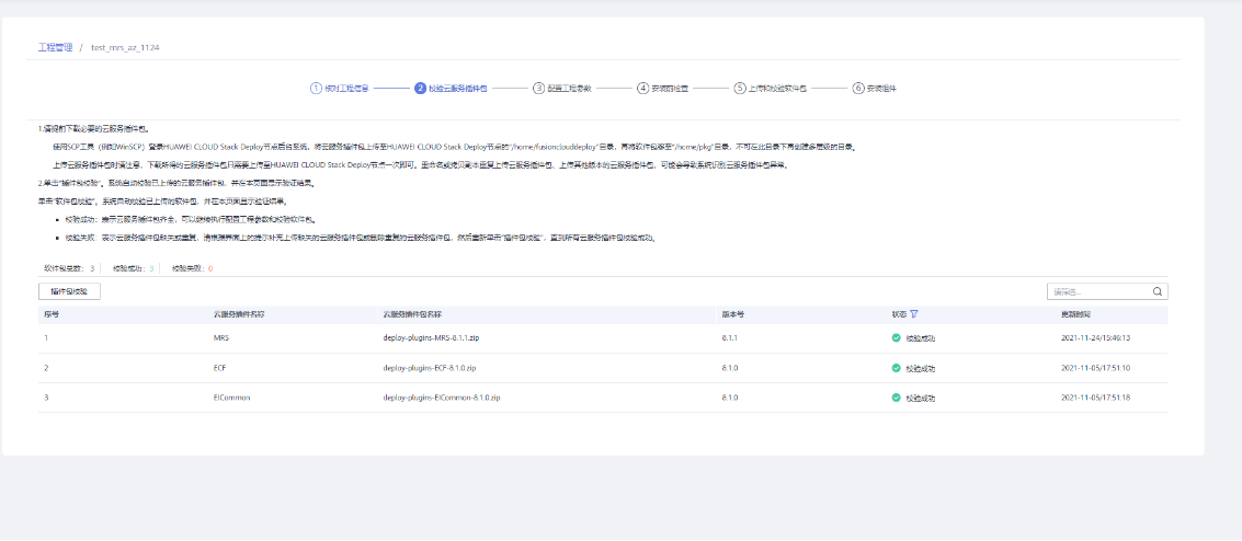 点击“校验云服务插件包”进入插件包校验页面,然后在页面上查找“插件包校验”按钮并点击,MRS管理面当前安装需要依赖ECF和EICommon插件包,三个插件包全部校验完成后才会显示“校验成功”,否则按照提示信息,补充校验文件和缺的插件包;