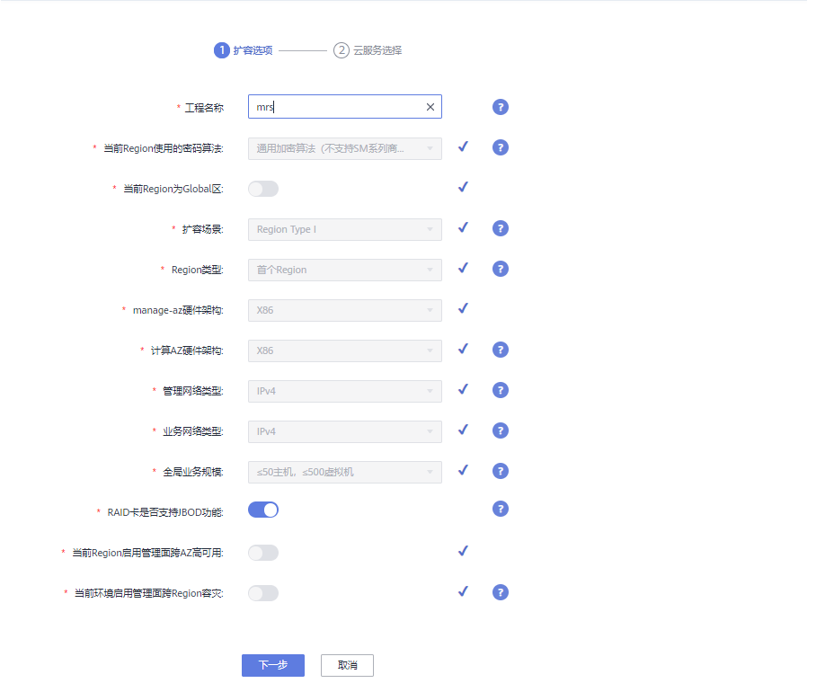 其中安装ECS模式和完整模式时,需要填写MRS业务主机组,按照当前环境实际拥有的主机组以及集成设计阶段规划给MRS业务使用的主机组进行填写,直通盘配置为下拉框,按照当前物料规划选择对应配置,如实际环境全部不符合,则按照参数描述选择一符合架构的配置,安装完成后按照安装指导手动创建规格;