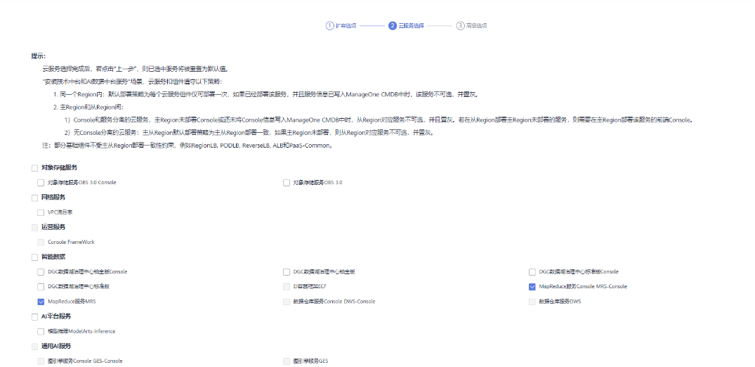 在“云服务选择”页面,在“智能数据区域”选择“MapReduce服务MRS”和“MapReduce服务Console MRS-Console”,然后单击“下一步”。