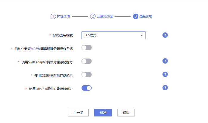 在“高级选项”页面选择MRS部署模式,目前MRS支持的部署模式有:ECS模式,BMS模式,物理机纳管模式,完整模式共四种,需要按照规划和当前环境具备的物料进行选择。选择为MRS提供对象存储能力配置,该选项也要根据环境实际提供对象存储能力的来源进行选择。选择完成后点击“创建”。