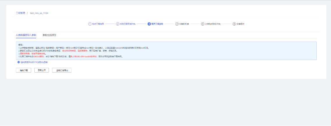 插件包校验完成后点击”配置工程参数“进入参数页面,点击”模板下载“下载本次工程参数模板,并填写参数模板中内容;