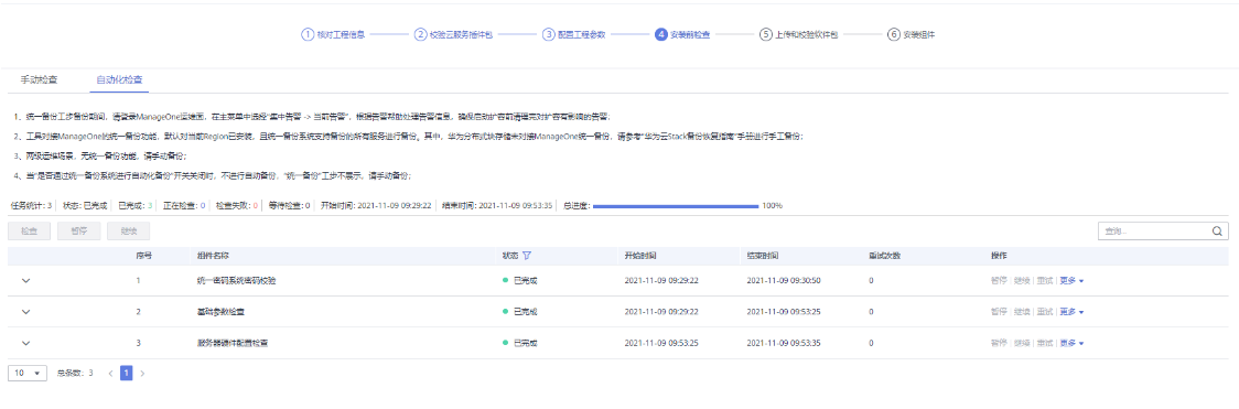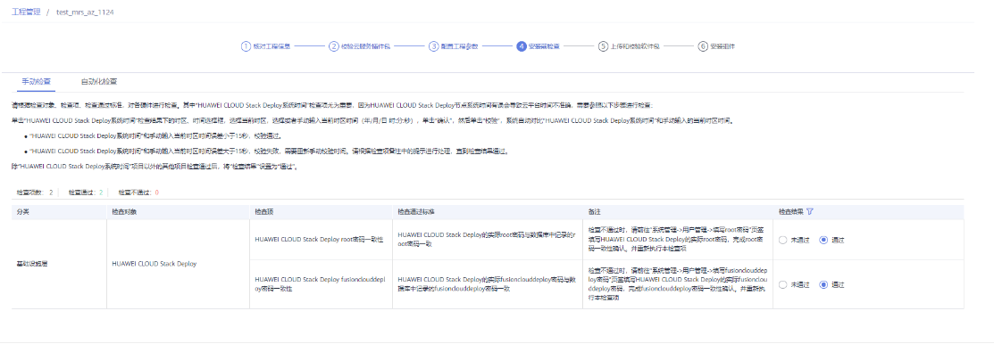 点击“安装前检查”进入安装前检查页面,在手动检查页面按照页面提示进行手动检查,检查完成后将检查结果填写至右侧,检查完成后点击页面“自动化检查”;