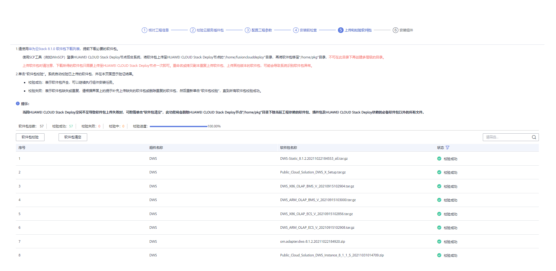 点击“上传和校验软件包”进行软件包的校验,软件包校验会校验包的存在和完整性,需要asc校验文件,如果缺包则从配套下载地址中下载补全并上传,然后重新校验;