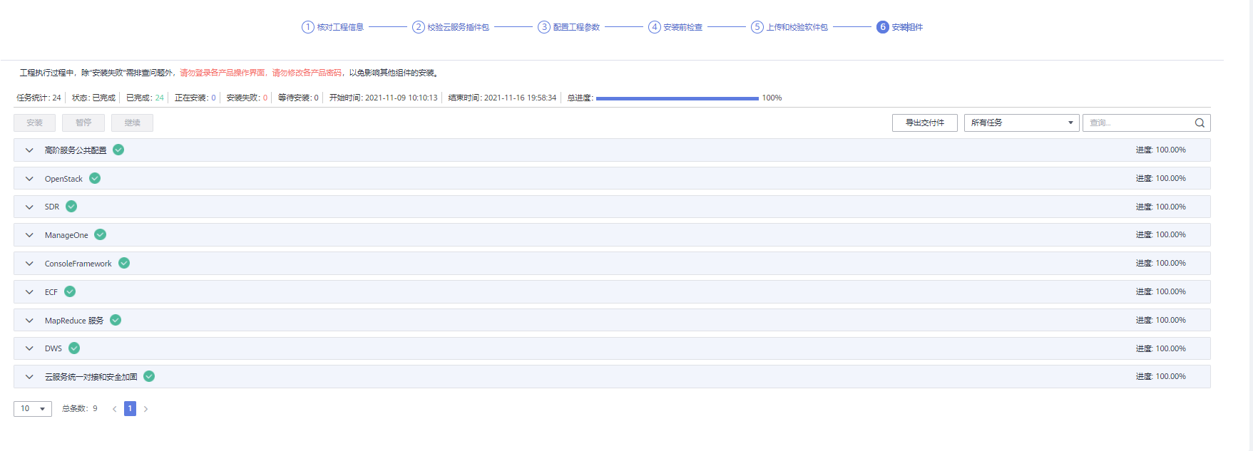 软件包校验完整后,点击“安装组件”,在安装组件页面点击“安装”等待安装完成。