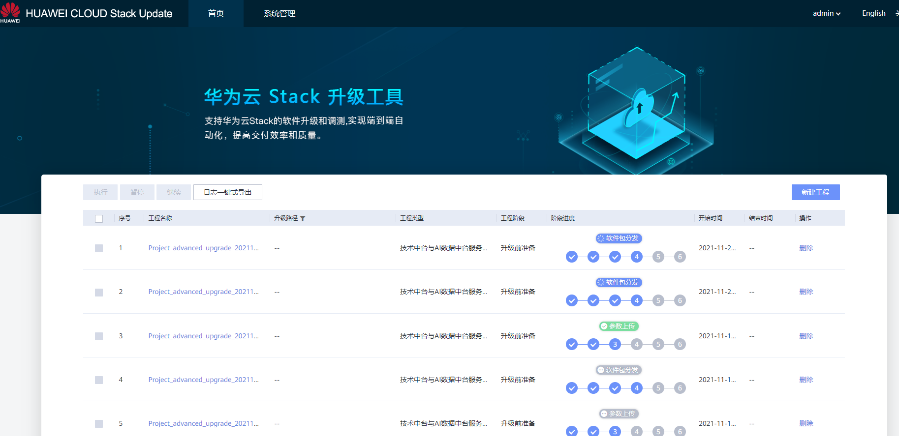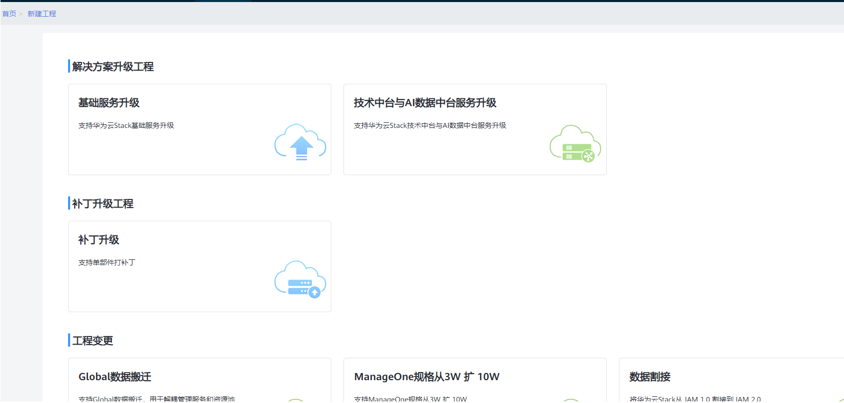 在新建工程页面查找“技术中台和AI数据中台服务升级”并单击,然后在弹窗内设置工程名称;