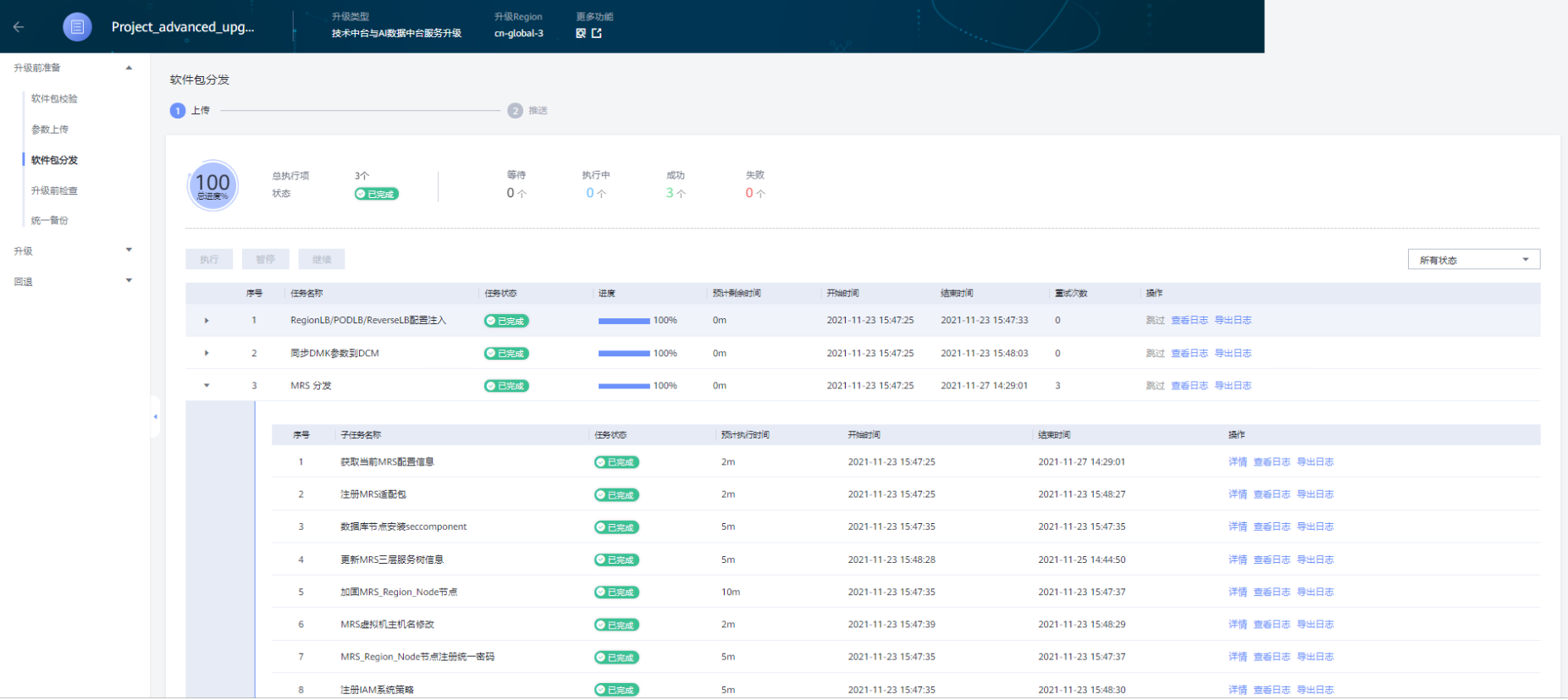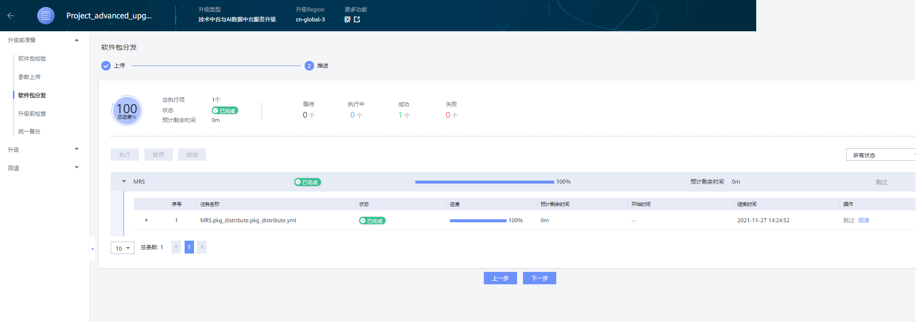 在“软件包上传”页面上点击“执行”按钮,执行软件包分发;等待分发完成,其中包括注册目标版本MRS管理面对应的租户侧镜像,较为耗时;完成后点击下一步;